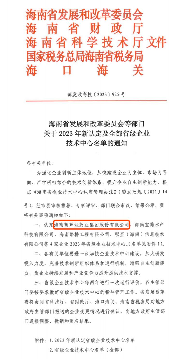 近日,海南省发改委等多部门联合公布了《关于2023年新认定及全部省级企业技术中心名单的通知》,其中,海南bifa必发药业集团股份有限公司成功通过评审,被认定为省级企业技术中心,是本次获批的4家企业之一。